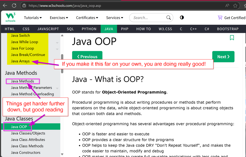 If you get through most of the pages of the first section then your foundational basics will be well on their way, leaving you more room to focus on FRC Robot-specific content during our two days at the camp. Beyond the first section, things get more complex fairly quickly but there could be some good reading things to touch on such as pages on Methods and OOP concepts.